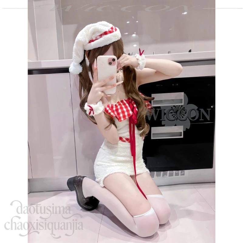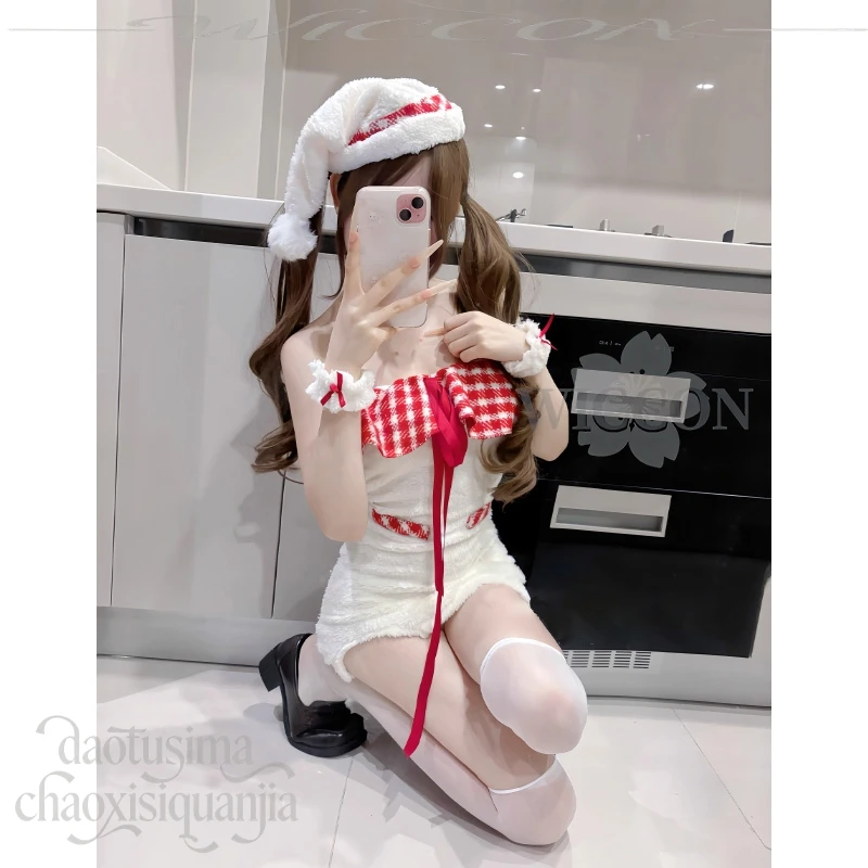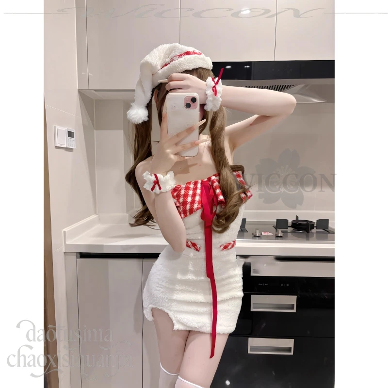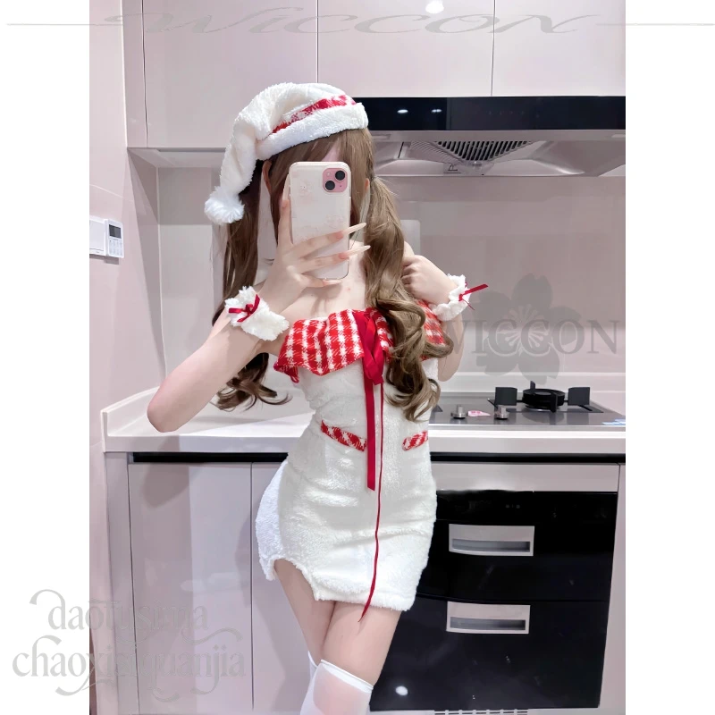 Cute Fluffy Plaid Lace Halter Off-shoulder Bodycon Mini Dress Kawaii White Lolita Cos Original Design Christmas Event Party
